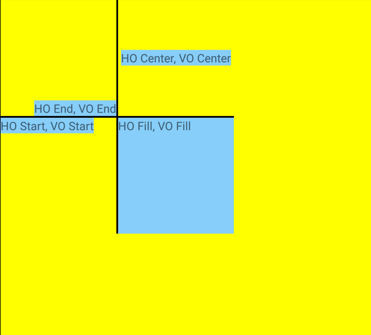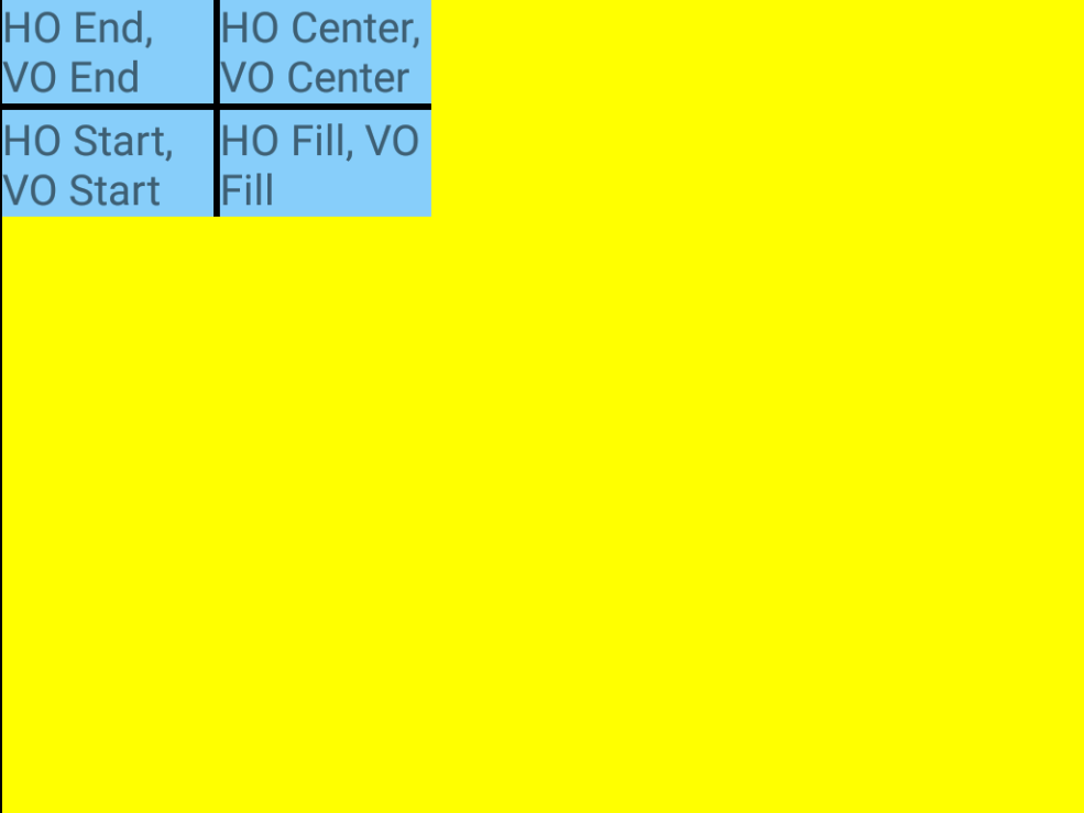 *HO = HorizontalOptions, VO = VerticalOptions, Grid’s BackgroundColor = Yellow, Labels’ BackgroundColor = Blue