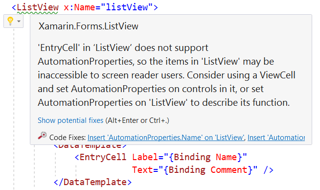 There are a lot of code-level decisions that can make or break your app’s accessibility, such as selecting controls that don’t support AutomationProperties, like EntryCell, which makes it impossible to make this aspect of your app accessible. Instead, you would need to rewrite the EntryCell to a more accessible alternative implementation.