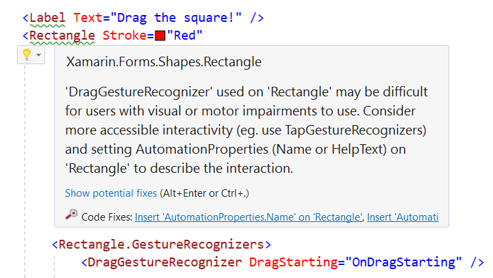 For example, it can suggest setting AutomationProperties.Name or HelpText on selectable controls such as Button, reminding you to describe their function for the benefit of screen reader users. Without additional context, a user with a screen reader might not understand why they would click “Ok”.